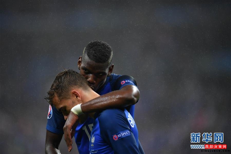 7月3日,法國(guó)隊(duì)球員博格巴(后)與格里茲曼在比賽后交流。當(dāng)日,在法國(guó)巴黎進(jìn)行的2016年歐洲足球錦標(biāo)賽四分之一決賽中,法國(guó)隊(duì)以5比2戰(zhàn)勝冰島隊(duì),晉級(jí)四強(qiáng)。新華社記者陶希夷攝