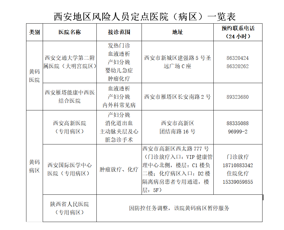 目前,經(jīng)省市協(xié)調(diào),西安地區(qū)已設(shè)立“黃碼醫(yī)院”2家“黃碼病區(qū)”2個(名單見下表),后續(xù)開設(shè)的“黃碼醫(yī)院”“黃碼病區(qū)”等風(fēng)險人員定點醫(yī)院(病區(qū))由地市自行發(fā)布。