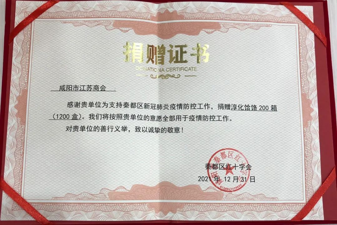 面對新一輪疫情,咸陽市江蘇商會及會員企業(yè)以不同的方式表達(dá)對咸陽市一線工作人員的關(guān)懷、對咸陽戰(zhàn)“疫”的支持,展現(xiàn)了一幕幕一心共同抗疫情的感人畫面,充分展現(xiàn)了咸陽市江蘇商會助力抗擊疫情的決心和信心,秦都區(qū)紅十字會向咸陽市江蘇商會頒發(fā)捐贈證書。