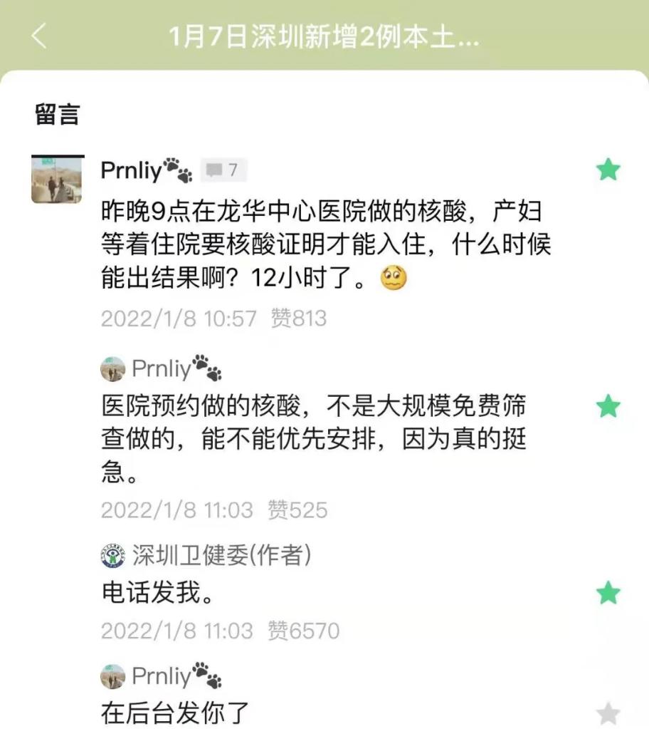 8日上午10時57分,在“深圳衛(wèi)健委”的微信公眾號推文下,一位叫“Prnliy”的網(wǎng)友留言,引起深圳市衛(wèi)健委工作人員的關(guān)注。這位網(wǎng)友說:“昨晚9點在龍華中心醫(yī)院做的核酸,產(chǎn)婦等著住院要核酸證明才能入住,什么時候能出結(jié)果?。?2個小時了。”