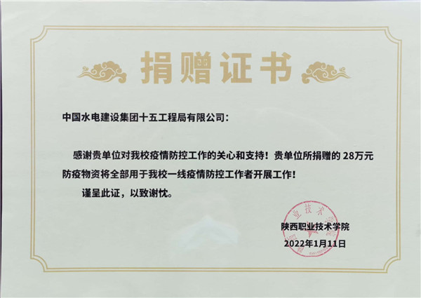 1月11日下午15:00,在陜西職業(yè)技術(shù)學(xué)院舉行簡短捐贈儀式,陜西職業(yè)技術(shù)學(xué)院黨委副書記、院長劉勝輝,黨委副書記、紀(jì)委書記何軍,副院長王慶等參加了捐贈儀式。劉勝輝代表學(xué)院黨委向我公司表示感謝,他表示,在疫情防控的關(guān)鍵時刻,水電十五局一周內(nèi)2批次送來價值近28萬元生活物資,及時緩解更極大充實和豐富了我??挂呱钗镔Y,為我院師生樹立了光輝榜樣,堅定了共克時艱的信心和決心。何軍向公司黨委副書記、紀(jì)委書記、工會主席任志宏贈送了捐款證明和感謝信。任志宏表示,水電十五局作為駐陜央企,一直以來,堅決貫徹落實黨中央決策部署,主動響應(yīng)陜西省委組織部和省國資委號召,面對此次疫情,將積極踐行央企擔(dān)當(dāng),履行社會責(zé)任,用實際行動為西安高校疫情防控貢獻(xiàn)一份力量!