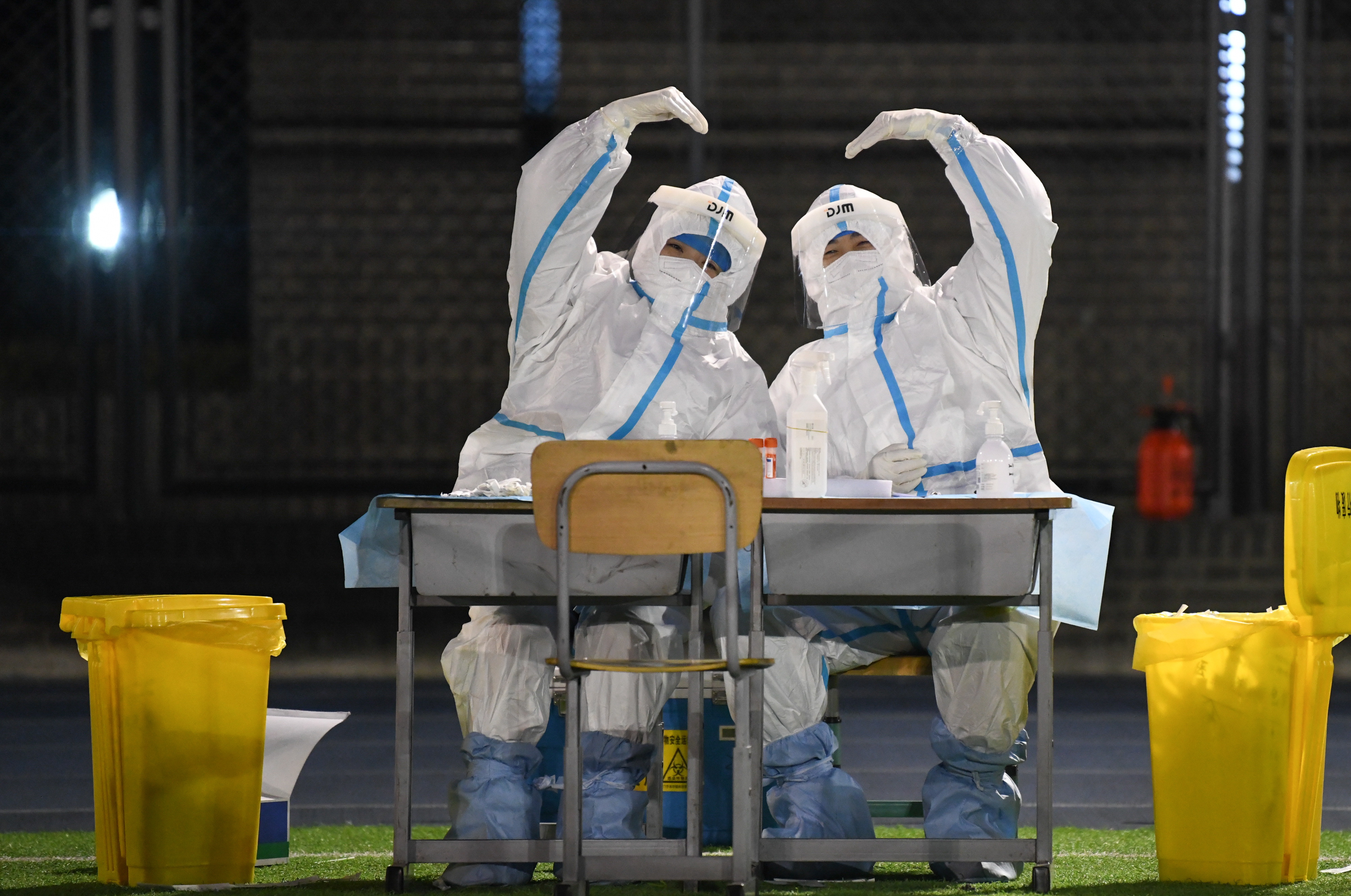 2022年1月10日凌晨,在天津市南開(kāi)區(qū)鼓樓街道中營(yíng)小學(xué)核酸檢測(cè)點(diǎn),兩名醫(yī)務(wù)人員做出“比心”手勢(shì)。新華社記者 孫凡越 攝