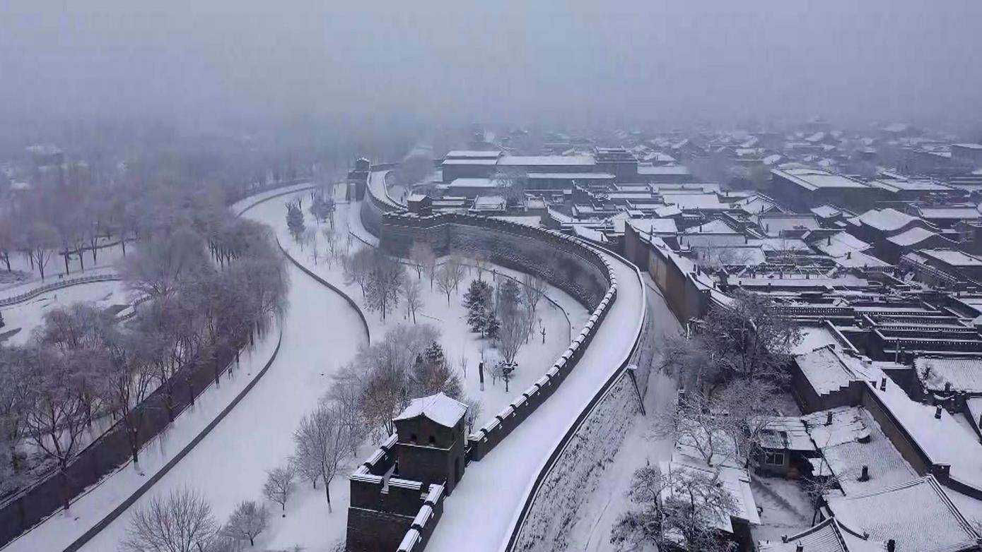 △2022年1月24日,平遙迎來降雪天氣,整個(gè)古城的輪廓被銀白筆墨勾勒出來。(總臺央視記者 范凱拍攝)