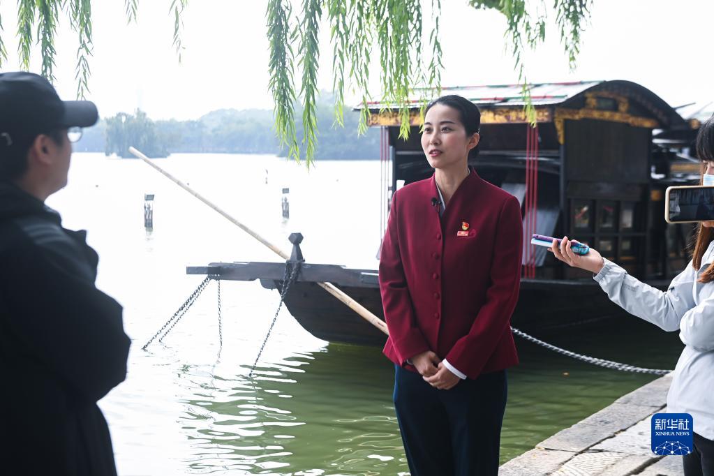 10月16日,在浙江省嘉興市,南湖革命紀(jì)念館講解員張一在接受采訪(fǎng)。新華社記者 徐昱 攝